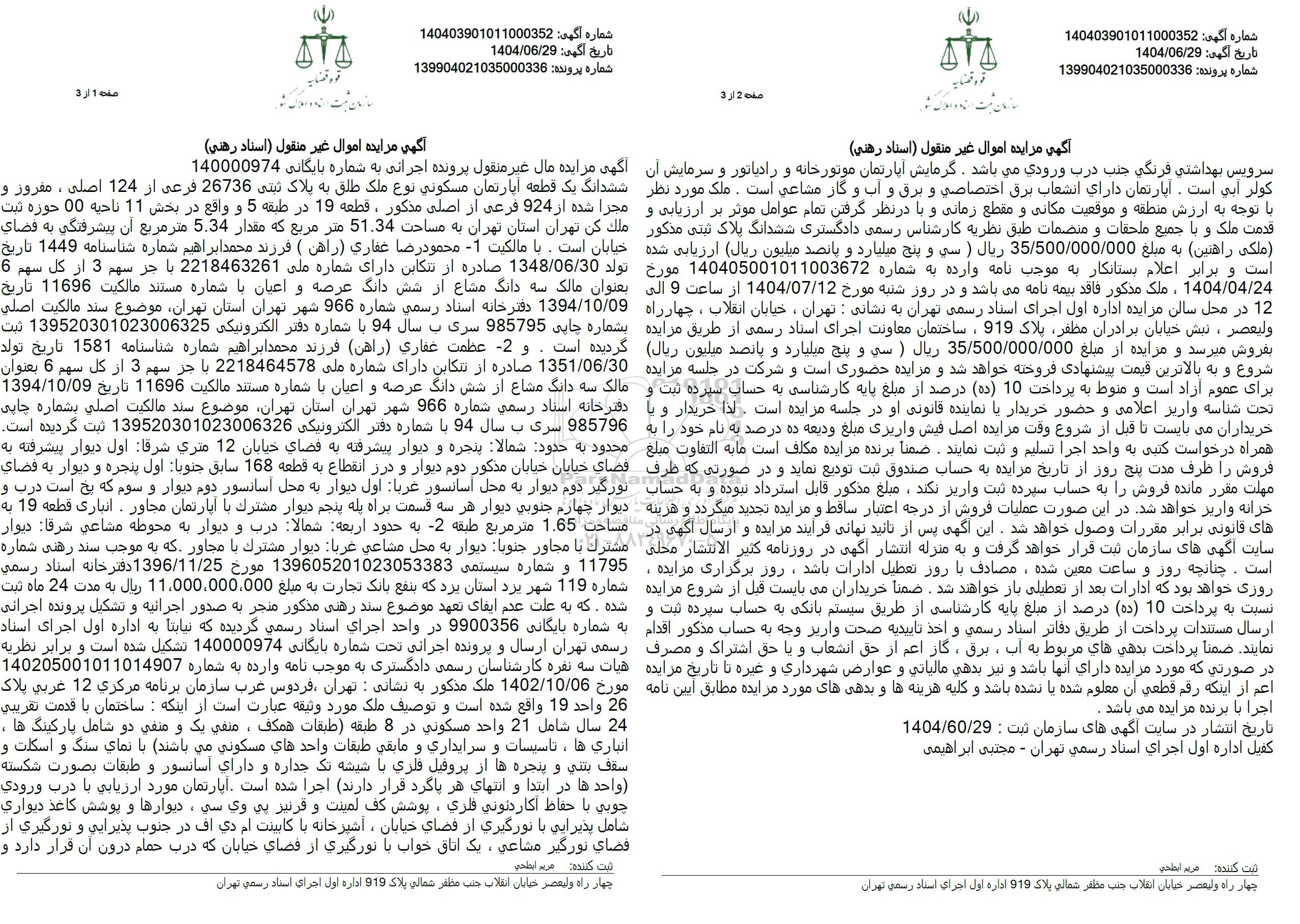 آگهی مزایده اموال غیر منقول (اسناد رهنی)