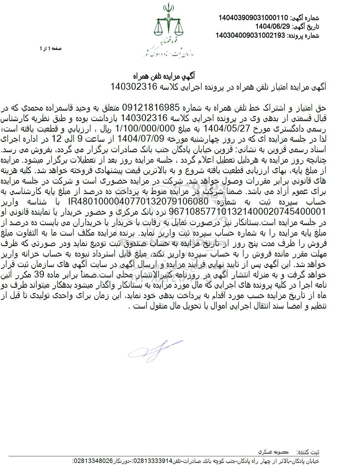 حق امتیاز و اشتراک خط تلفن همراه به شماره 09121816985 متعلق به وحید قاسمزاده محمدی که در قبال قسمتی از بدهی وی در پرونده اجرایی کلاسه 140302316 بازداشت بوده و طبق نظریه کارشناس رسمی دادگستری مورخ 1404.05.27 به مبلغ 1.100.000.000 ريال ، ارزيابي و قطعیت یافته است؛ لذا در جلسه مزایده ای که در روز چهارشنبه مورخه 1404.07.09 از ساعت 9 الی 12 در اداره اجرای اسناد رسمی قزوین به نشانی قزوین خیابان پادگان جنب بانک صادرات برگزار میگردد بفروش می رسد. چنانچه روز مزایده به هر دلیل تعطیل اعلام گردد، جلسه مزایده روز بعد از تعطیلات برگزار میشود. مزایده از مبلغ پایه بهای ارزیابی قطعیت یافته شروع و به بالاترین قیمت پیشنهادی فروخته خواهد شد. کلیه هزینه های قانونی برابر مقررات وصول خواهد شد شرکت در مزایده حضوری است و شرکت در جلسه مزایده برای عموم آزاد می باشد ضمنا شرکت در مزایده منوط به پرداخت ده درصد از مبلغ پایه کارشناسی به حساب سپرده ثبت به شماره IR4801000040770132079106080 با شناسه واریز 967108577101321400020745400001 نزد بانک مرکزی و حضور خریدار یا نماینده قانونی او در جلسه مزایده است. بستانکار نیز در صورت تمایل به رقابت با خریدار یا خریداران می بایست ده درصد از مبلغ پایه مزایده را به شماره حساب سپرده ثبت واریز نماید برنده مزایده مکلف است ما به التفاوت مبلغ فروش را ظرف مدت پنج روز از تاریخ مزایده به حساب صندوق ثبت تودیع نماید و در صورتی که ظرف مهلت مقرر مانده فروش را به حساب سپرده واریز نکند مبلغ قابل استرداد نبوده به حساب خزانه واریز خواهد شد. این آگهی پس از تایید نهایی فرایند مزایده و ارسال آگهی در سایت آگهی های سازمان ثبت قرار خواهد گرفت و به منزله انتشار آگهی در روزنامه کثیر الانتشار محلی است. ضمنا برابر ماده 39 مکرر آئین نامه اجرا در کلیه پروندههای اجرایی که مال مورد مزایده به بستانکار واگذار میشود بدهکار میتواند ظرف دو ماه از تاریخ مزایده حسب مورد اقدام به پرداخت بدهی خود نماید این زمان برای واحدی تولیدی تا قبل از تنظيم و امضا سند انتقال اجرایی اموال یا تحویل مال منقول است