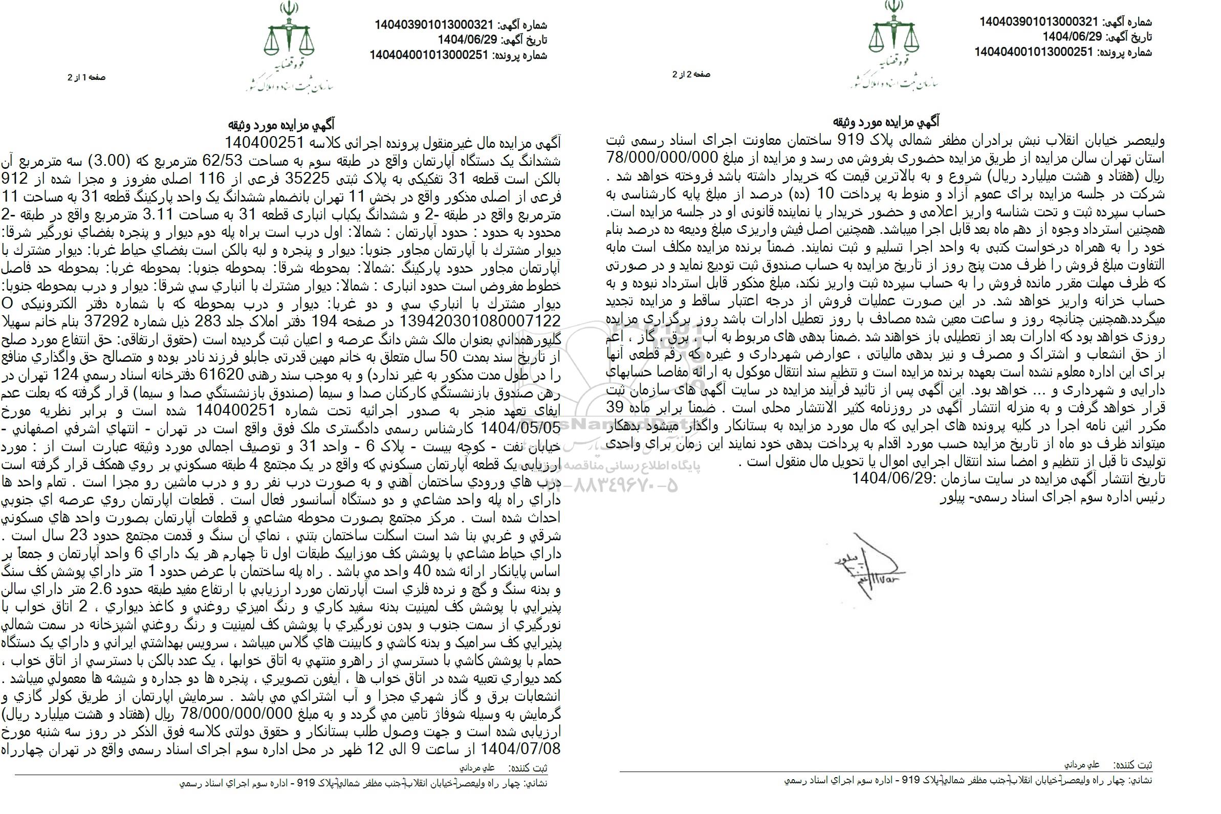 ششدانگ یک دستگاه آپارتمان واقع در طبقه سوم به مساحت 62.53 متر مربع که (3.00) سه متر مربع آن بالکن است قطعه 31 تفکیکی به پلاک ثبتی 35225 فرعی از 116 اصلی مفروز و مجرا شده از 912 فرعی از اصلی مذکور واقع در بخش 11 تهران بانضمام ششدانگ یک واحد پارکینگ قطعه 31 به مساحت 11 متر مربع واقع در طبقه 2 و ششدانگ یکباب انباری قطعه 31 به مساحت 3.11 متر مربع واقع در طبقه 2 محدود به حدود : حدود آپارتمان : شمالا اول درب است براه پله دوم دیوار و پنجره بفضای نورگیر شرقا. دیوار مشترك با آپارتمان مجاور جنوبا دیوار و پنجره و ليه بالکن است بفضاي حياط غربا دیوار مشترک با آپارتمان مجاور حدود پارکینگ : شمالا بمحوطه شرقا بمحوطه جنوبا بمحوطه غربا بمحوطه حد فاصل خطوط مفروض است حدود انباری : شمالا دیوار مشترك با انباری سی شرقا دیوار و درب بمحوطه جنوبا دیوار مشترک با انباري سي و دو غربا دیوار و درب بمحوطه که با شماره دفتر الکترونیکی 0 گلپور همدانی بعنوان مالک شش دانگ عرصه و اعیان ثبت گردیده است حقوق ارتفاقی حق انتفاع مورد صلحاز تاریخ سند بمدت 50 سال متعلق به خانم مهین قدرتی جابلو فرزند نادر بوده و متصالح حق واگذاری منافع را در طول مدت مذکور به غیر ندارد و به موجب سند رهنی 61620 دفترخانه اسناد رسمی 124 تهران در رهن صندوق بازنشستگی کارکنان صدا و سیما صندوق بازنشستگی صدا و سیما قرار گرفته که بعلت عدم ایفای تعهد منجر به صدور اجرائیه تحت شماره 140400251 شده است و برابر نظریه مورخ 1404.05.05 کارشناس رسمی دادگستری ملک فوق واقع است در تهران - انتهاي اشرفی اصفهانی -خیابان نفت - کوچه بیست - پلاک 6 - واحد 31 و توصیف اجمالی مورد وثیقه عبارت است از : مورد ارزیابی یک قطعه آپارتمان مسکونی که واقع در یک مجتمع 4 طبقه مسکونی بر روی همکف قرار گرفته است. درب هاي ورودي ساختمان اهنی و به صورت درب نفر رو و درب ماشین رو مجزا است. تمام واحد ها دارای راه پله واحد مشاعی و دو دستگاه آسانسور فعال است. قطعات اپارتمان روی عرصه اي جنوبي احداث شده است. مرکز مجتمع بصورت محوطه مشاعی و قطعات آپارتمان بصورت واحد هاي مسكوني شرقی و غربی بنا شد است اسکلت ساختمان بتنی ، نمای آن سنگ و قدمت مجتمع حدود 23 سال است . دارای حیاط مشاعی با پوشش کف موزاییک طبقات اول تا چهارم هر یک دارای 6 واحد آپارتمان و جمعا بر اساس پایانکار ارائه شده 40 واحد می باشد. راه پله ساختمان با عرض حدود 1 متر دارای پوشش کف سنگ و بدنه سنگ و گچ و نرده فلزی است آپارتمان مورد ارزیابی با ارتفاع مفید طبقه حدود 2.6 متر داراي سالن پذیرایی با پوشش کف لمينيت بدنه سفید کاری و رنگ امیزی روغني و كاغذ ديواري 2 اتاق خواب با نورگیری از سمت جنوب و بدون نورگیری با پوشش کف لمینیت و رنگ روغنی اشپزخانه در سمت شمالی پذیرایی کف سرامیک و بدنه کاشی و کابینت های گلاس میباشد. سرویس بهداشتی ایرانی و دارای یک دستگاه حمام با پوشش کاشی با دسترسی از راهرو منتهی به اتاق خوابها، یک عدد بالکن با دسترسی از اتاق خواب . کمد دیواری تعبیه شده در اتاق خوابها، ایفون تصویری، پنجره ها دو جداره و شیشه ها معمولی میباشد . انشعابات برق و گاز شهری مجرا و آب اشتراکی میباشد. سرمایش اپارتمان از طریق کولر گازی و گرمایش به وسیله شوفاژ تامین می گردد و به مبلغ 78.000.000.000 ريال (هفتاد و هشت میلیارد ریال) ارزیابی شده است و جهت وصول طلب بستانکار و حقوق دولتی کلاسه فوق الذکر در روز سه شنبه مورخ 1404.07.08 از ساعت 9 الی 12 ظهر در محل اداره سوم اجرای اسناد رسمی واقع در تهران چهارراه ولیعصر خیابان انقلاب نبش برادران مظفر شمالی پلاک 919 ساختمان معاونت اجرای اسناد رسمی ثبت استان تهران سالن مزایده از طریق مزایده حضوری بفروش میرسد و مزایده از مبلغ 78.000.000.000 ریال هفتاد و هشت میلیارد ریال شروع و به بالاترین قیمت که خریدار داشته باشد فروخته خواهد شد . شرکت در جلسه مزایده برای عموم آزاد و منوط به پرداخت 10 (ده) درصد از مبلغ پایه کارشناسی به حساب سپرده ثبت و تحت شناسه واریز اعلامی و حضور خریدار با نماینده قانونی او در جلسه مزایده