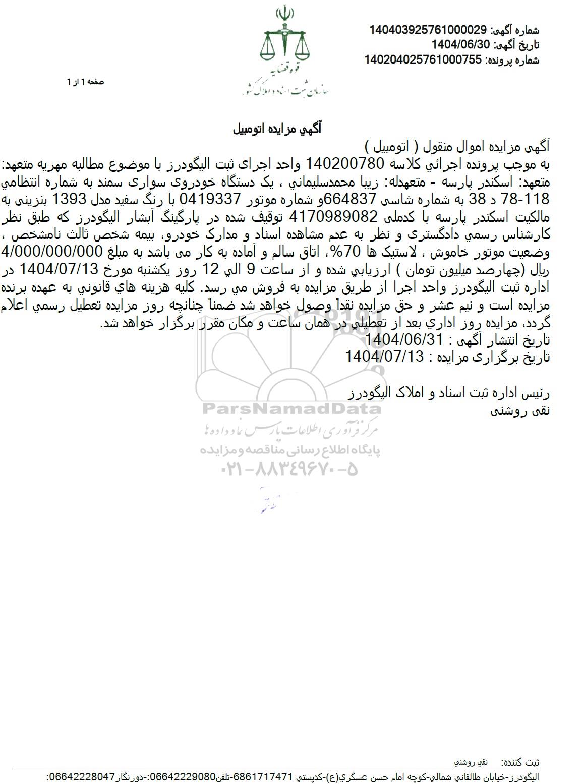 متعهد اسکندر پارسه - متعهدله زیبا محمد سلیمانی ، یک دستگاه خودروی سواری سمند به شماره انتظامی 118-78 د 38 به شماره شاسی 664837 و شماره موتور 0419337 با رنگ سفید مدل 1393 بنزینی به مالکیت اسکندر پارسه با کدملی 4170989082 توقیف شده در پارگینگ آبشار الیگودرز که طبق نظر کارشناس رسمی دادگستری و نظر به عدم مشاهده اسناد و مدارک خودرو بیمه شخص ثالث نامشخص ، وضعیت موتور خاموش ، لاستیک ها 70% ، اتاق سالم و آماده به کار میباشد به مبلغ 4.000.000.000 ریال چهارصد میلیون تومان ارزیابی شده و از ساعت 9 الی 12 روز یکشنبه مورخ 1404.07.13 در اداره ثبت الیگودرز واحد اجرا از طریق مزایده به فروش میرسد. کلیه هزینه های قانونی به عهده برنده مزایده است و نیم عشر و حق مزایده نقداً وصول خواهد شد ضمنا چنانچه روز مزایده تعطیل رسمي اعلام گردد مزایده روز اداری بعد از تعطیلی در همان ساعت و مکان مقرر برگزار خواهد شد.