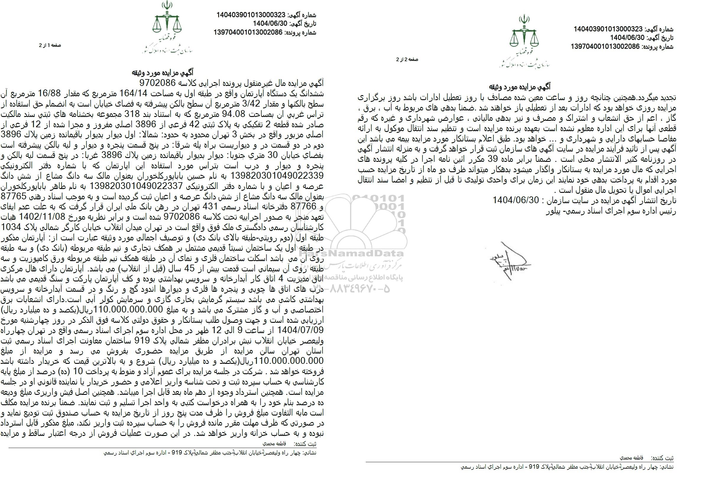 ششدانگ یک دستگاه آپارتمان واقع در طبقه اول به مساحت 164/14 متر مربع که مقدار 16/88 متر مربع آن سطح بالکنها و مقدار 3/42 متر مربع آن سطح بالکن پیشرفته به فضای خیابان است به انضمام حق استفاده از تراس غربی ان بمساحت 94.08 متر مربع که به استناد بند 318 مجموعه بخشنامه های ثبتی سند مالکیت صادر شده قطعه 2 تفکیکی به پلاک ثبتی 42 فرعی از 3896 اصلی مفروز و مجزا شده از 12 فرعی از اصلی مزبور واقع در بخش 3 تهران محدود به حدود شمالا اول دیوار بدیوار باقیمانده زمین پلاک 3896 دوم در دو قسمت در و دیواریست براه پله شرقا در پنج قسمت پنجره و دیوار و لبه بالکن پیشرفته است. بفضای خیابان 30 متری جنوبا دیوار بدیوار باقیمانده زمین پلاک 3896 غربا در پنج قسمت لبه بالکن و پنجره و دیوار و درب است بتراس مورد استفاده این اپارتمان که با شماره دفتر الکترونیکی 139820301049022339 به نام حسین باباپور کلخوران بعنوان مالک سه دانگ مشاع از شش دانگ عرصه و اعیان و با شماره دفتر الکترونیکی 139820301049022337 به نام طاهر باباپور کلخوران بعنوان مالک سه دانگ مشاع از شش دانگ عرصه و اعیان ثبت گردیده است و به موجب اسناد رهنی 87765 و 87766 دفترخانه اسناد رسمی 431 تهران در رهن بانک ملی ایران قرار گرفت که به علت عدم ایفای تعهد منجر به صدور اجراییه تحت کلاسه 9702086 شده است و برابر نظریه مورخ 1402.11.08 هیات کارشناسان رسمی دادگستری ملک فوق واقع است در تهران میدان انقلاب خیابان کارگر شمالی پلاک 1034 طبقه اول (دوم رویتی - طبقه بالای بانک دی) و توصیف اجمالی مورد وثیقه عبارت است از آپارتمان مذکور در طبقه اول یک ساختمان نسبتاً قدیمی مشتمل بر همکف تجاری و نیم طبقه مربوطه (بانک دی) و سه طبقه روی آن می باشد اسکلت ساختمان فلزی و نمای آن در طبقه همکف نیم طبقه مربوطه ورق کامپوزیت و سه طبقه روی آن سیمانی است قدمت بیش از 45 سال قبل از انقلاب می باشد آپارتمان دارای هال مرکزی اتاق مدیریت 4 اتاق کار آبدارخانه و سرویس بهداشتی بوده و کف آپارتمان پارکت و سنگ قدیمی می باشد درب های اتاق ها چوبی و پنجره ها فلزی و دیوارها اندود گچ و رنگ و در قسمت آبدارخانه و سرویس بهداشتی کاشی می باشد سیستم گرمایش بخاری گازی و سرمایش کولر آبی است. دارای انشعابات برق اختصاصی و آب و گاز مشترک میباشد و به مبلغ 110.000.000.000 ریال (یکصد و ده میلیارد ریال) ارزیابی شده است و جهت وصول طلب بستانکار و حقوق دولتی کلاسه فوق الذکر در روز چهارشنبه مورخ 1404.07.09 از ساعت 9 الی 12 ظهر در محل اداره سوم اجرای اسناد رسمی واقع در تهران ، چهارراه ولیعصر، خیابان انقلاب نبش برادران مظفر شمالی، پلاک 919 ساختمان معاونت اجرای اسناد رسمی ثبت استان تهران سالن مزایده از طریق مزایده حضوری بفروش می رسد و مزایده از مبلغ 110.000.000.000 ریال (یکصد و ده میلیارد ریال) شروع و به بالاترین قیمت که خریدار داشته باشد فروخته خواهد شد . شرکت در جلسه مزایده برای عموم آزاد و منوط به پرداخت 10 (ده) درصد از مبلغ پایه کارشناسی به حساب سپرده ثبت و تحت شناسه واریز اعلامی و حضور خریدار یا نماینده قانونی او در جلسه مزایده است. همچنین استرداد وجوه از دهم ماه بعد قابل اجرا میباشد. همچنین اصل فیش واریزی مبلغ ودیعه ده درصد بنام خود را به همراه درخواست کتبی به واحد اجرا تسلیم و ثبت نمایند. ضمناً برنده مزایده مکلف است ما به التفاوت مبلغ فروش را ظرف مدت پنج روز از تاریخ مزایده به حساب صندوق ثبت تودیع نماید و در صورتی که ظرف مهلت مقرر مانده فروش را به حساب سپرده ثبت واریز نکند مبلغ مذکور قابل استرداد نبوده و به حساب خزانه واریز خواهد شد. در این صورت عملیات فروش از درجه اعتبار ساقط و مزایده تجدید میگردد. همچنین چنانچه روز و ساعت معین شده مصادف با روز تعطیل ادارات باشد روز برگزاری مزایده روزی خواهد بود که ادارات بعد از تعطیلی باز خواهند شد . ضمنا بدهی های مربوط به آب ، برق ، گاز ، اعم از حق انشعاب و اشتراک و مصرف و نیز بدهی مالیاتی ، عوارض شهرداری و غیره که رقم قطعی آنها برای این اداره معلوم نشده است بعهده برنده مزایده است 