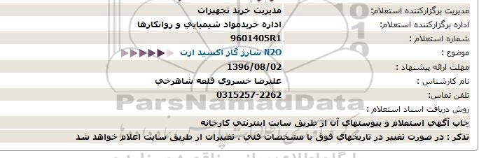 استعلام بها و موضوع استعلام استعلام، استعلام N20 شارژ گاز اکسید ازت به اطلاع کلیه شرکتها و افراد متخصص واجد شرایط میرساند، آگهی گذار در نظر دارد از طریق استعلام بها، نسبت به انتخاب و دریافت پیشنهادات اقدام نماید. این استعلام با کد آگهی ثبت شده در سامانه خبرگزاری پارس نماد : 957971 منتشر شده است. مشخصات استعلام : تاریخ شروع استعلام: 1396/07/27 آخرین مهلت ارسال پیشنهاد قیمت : 1396/08/02 و محل اجرای پروژه : استان اصفهان میباشد. استعلام قیمت مورد درخواست : استعلام، استعلام N20 شارژ گاز اکسید ازت با دستهبندیهای تخصصی و گروه های مرتبط : گازهای طبی و صنعتی و مخازن و تجهیزات مربوطه, استعلام اطلاع رسانی میگردد.