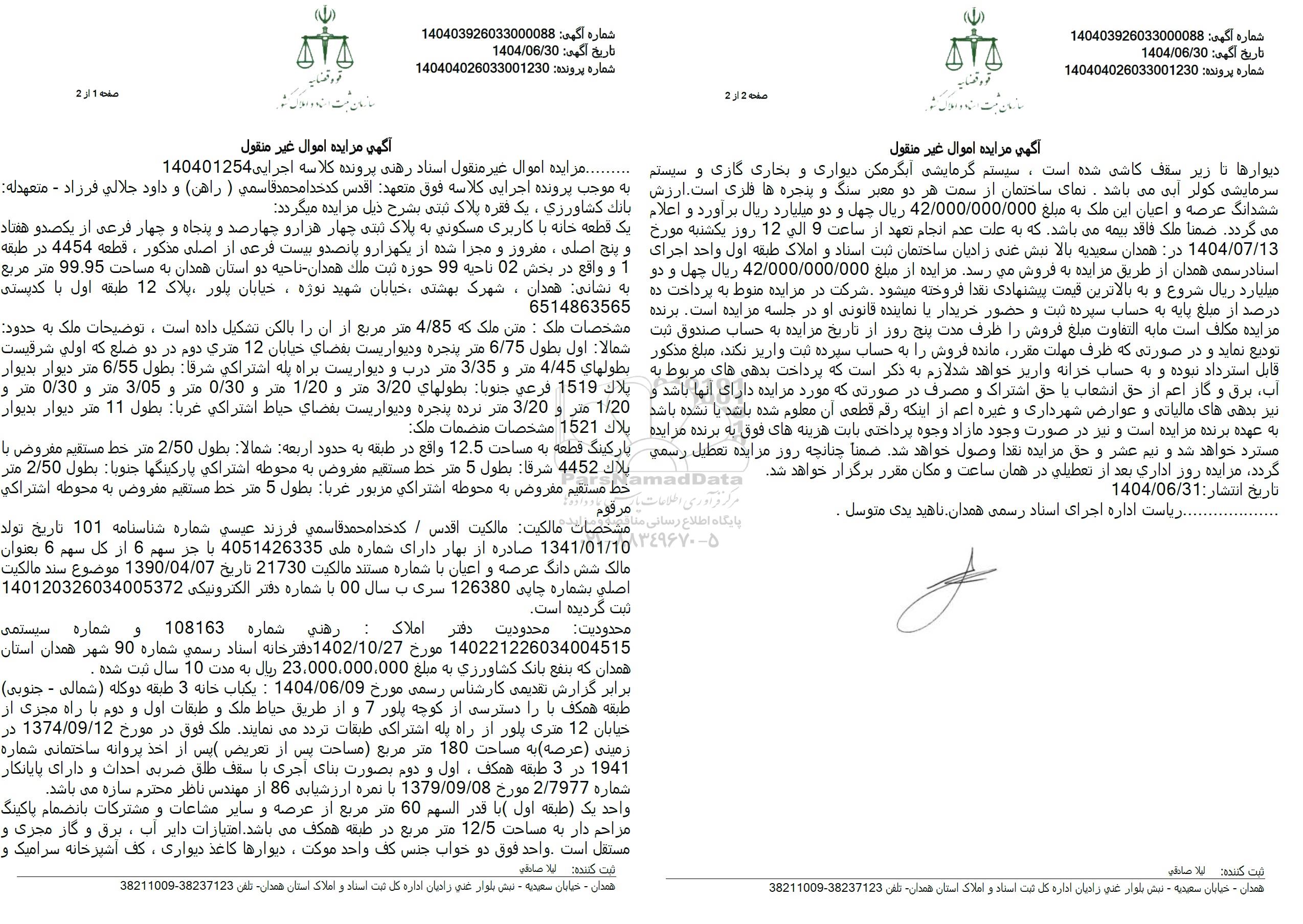 مزایده اموال غیر منقول اسناد رهنی پرونده کلاسه اجرایی 140401254