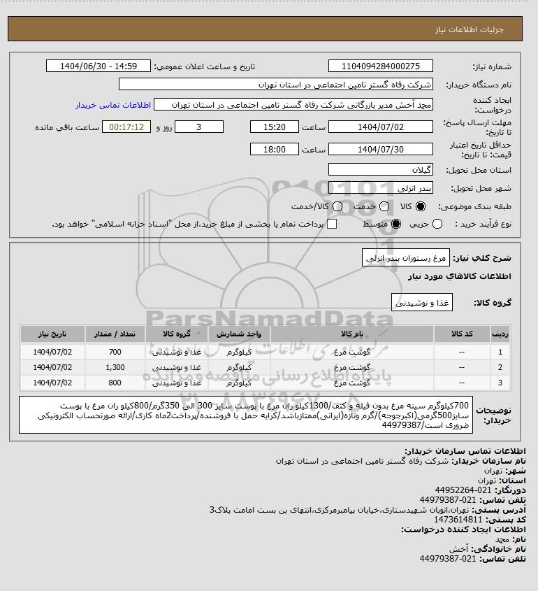 شرح کلی نیاز: مرغ رستوران بندر انزلی