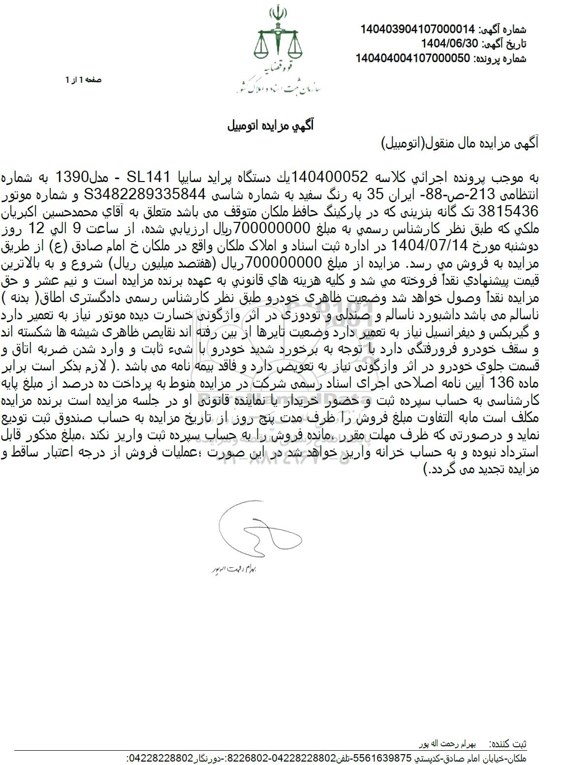 به موجب پرونده اجرائی كلاسه 140400052 یک دستگاه پراید سایپا SL141 - مدل 1390 به شماره انتظامی -213- ص - 88 ایران 35 به رنگ سفید به شماره شاسی S3482289335844 و شماره موتور 3815436 تک گانه بنزینی که در پارکینگ حافظ ملکان متوقف میباشد متعلق به آقای محمد حسین اکبریان ملکی که طبق نظر کارشناس رسمی به مبلغ 700000000 ریال ارزیابی شده از ساعت 9 الی 12 روز دوشنبه مورخ 1404.07.14 در اداره ثبت اسناد و املاک ملکان واقع در ملکان خ امام صادق (ع) از طریق مزایده به فروش می رسد. مزایده از مبلغ 700000000 ریال هفتصد میلیون ریال شروع و به بالاترین قیمت پیشنهادی نقداً فروخته می شد و کلیه هزینه های قانونی به عهده برنده مزایده است و نیم عشر و حق مزایده نقداً وصول خواهد شد وضعیت ظاهری خودرو طبق نظر کارشناس رسمی دادگستری اطاق (بدنه ) ناسالم می باشد داشبورد ناسالم و صندلی و تودوزی در اثر واژگونی خسارت دیده موتور نیاز به تعمیر دارد و گیربکس و دیفرانسیل نیاز به تعمیر دارد وضعیت تایرها از بین رفته اند نقایص ظاهری شیشه ها شکسته اند و سقف خودرو فرورفتگی دارد با توجه به برخورد شدید خودرو با شیء ثابت و وارد شدن ضربه اتاق و قسمت جلوی خودرو در اثر واژگونی نیاز به تعویض دارد و فاقد بیمه نامه میباشد . لازم بذکر است برابر ماده 136 آیین نامه اصلاحی اجرای اسناد رسمی شرکت در مزایده منوط به پرداخت ده درصد از مبلغ پایه کارشناسی به حساب سپرده ثبت و حضور خریدار یا نماینده قانونی او در جلسه مزایده است برنده مزایده مكلف است ما به التفاوت مبلغ فروش را ظرف مدت پنج روز از تاریخ مزایده به حساب صندوق ثبت تودیع نماید و در صورتی که ظرف مهلت مقرر ، مانده، فروش را به حساب سپرده ثبت واریز نکند ، مبلغ مذکور قابل استرداد نبوده و به حساب خزانه واریز خواهد شد در این صورت عملیات فروش از درجه اعتبار ساقط و مزایده تجدید می گردد.