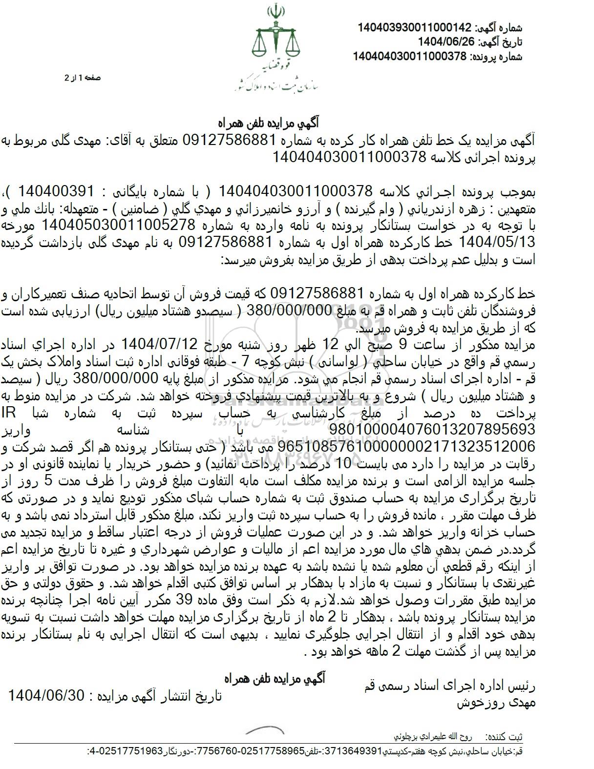 آگهی مزایده یک خط تلفن همراه کار کرده به شماره 09127586881 متعلق به آقای: مهدی گلی مربوط به پرونده اجرائی کلاسه 140404030011000378