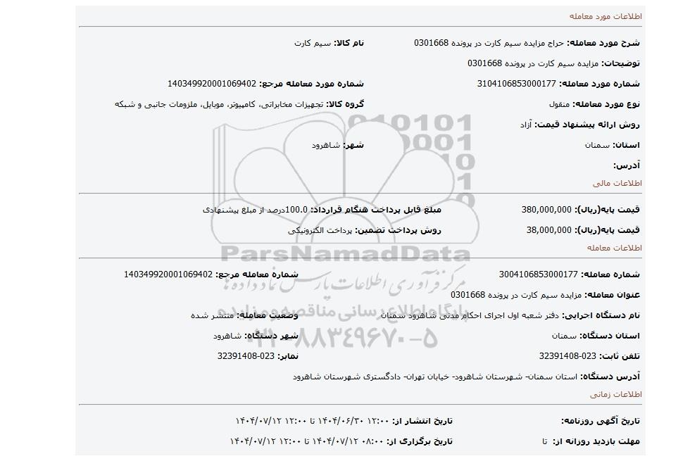 | شرح مورد معامله: حراج مزایده سیم کارت در پرونده 0301668 | نام کالا: سیم کارت | |