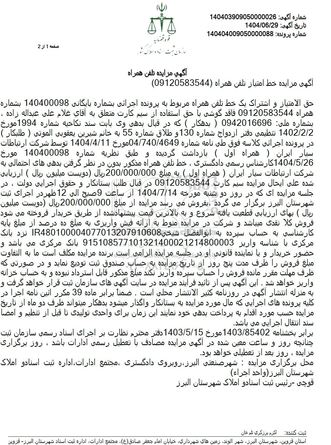 حق الامتیاز و اشتراک یک خط تلفن همراه مربوط به پرونده اجرائی بشماره بایگانی 140400098 بشماره همراه 09120583544 فاقد گوشی با حق استفاده از سیم کارت متعلق به آقای غلام علی عبداله زاده ، بشماره ملی : 0942016696 (بدهکار) که در قبال بدهی وی بابت سند نکاحیه شماره 1994 مورخ 1402/2/2 تنظیمی دفتر ازدواج شماره 130 و طلاق شماره 55 به خانم شیرین یعقوبى الموتى ( طلبكار ) در پرونده اجرائی کلاسه فوق طی نامه شماره 04.740.4669 مورخ 1404.4.11 توسط شرکت ارتباطات سیار ایران ( همراه اول ) بازداشت گردیده و طبق نظریه شماره 140400098 مورخ 1404/5/26 کارشناس رسمی دادگستری ، خط تلفن همراه مذکور بدون در نظر گرفتن بدهی های احتمالی به شرکت ارتباطات سیار ایران ) همراه اول ) به مبلغ 200/000/000 ریال دویست میلیون ریال ) ارزیابی شده علی ایحال مزایده سیم کارت 09120583544 در قبال طلب بستانکار و حقوق اجرایی دولت ، در جلسه مزایده ای که در روز دو شنبه مورخه 1404.7.14 از ساعت 9 صبح الی 12 ظهر در اجرای ثبت شهرستان البرز برگزار میگردد ، بفروش میرسد مزایده از مبلغ200.000.000 ريال (دویست میلیون ریال ) بهای ارزیابی قطعیت یافته شروع و به بالاترین قیمت پیشنهاد شده از طریق خریدار فروخته می شود فروش کلا نقدی میباشد و شرکت در مزایده منوط به ارائه فیش واریزی به مبلغ ده درصد از مبلغ پایه کارشناسی به حساب سپرده به ابوالفضل شيخي IR480100004077013207910608 نزد بانک مرکزی با شناسه واریز 915108577101321400021214800003 بانک مرکزی می باشد و حضور خریدار و یا نماینده قانونی او در جلسه مزایده الزامی است برنده مزایده مکلف است ما به التفاوت مبلغ فروش را ظرف مدت پنج روز از تاریخ مزایده به حساب صندوق ثبت تودیع نماید و در صورتی که ظرف مهلت مقرر مانده فروش را حساب سپرده واریز نکند مبلغ مذکور قابل استرداد نبوده و به حساب خزانه واریز خواهد شد. این آگهی پس از تائید فرآیند مزایده در سایت آگهی های سازمان ثبت قرار خواهد گرفت و به منزله انتشار آگهی در روزنامه کثیر الانتشار محلی است . ضمناً برابر ماده 39 مكرر آئین نامه اجرا در کلیه پرونده های اجرایی که مال مورد مزایده به بستانکار واگذار میشود بدهکار میتواند ظرف دو ماه از تاریخ مزایده حسب مورد اقدام به پرداخت بدهی خود نمایند این زمان برای واحدی تولیدی تا قبل از تنظیم و امضا سند انتقال اجرایی می باشد.