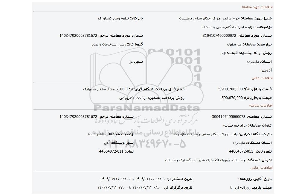| شرح مورد معامله: حراج مزایده اجرای احکام مدنی چمستان | نام کالا: قطعه زمین کشاورزی | |