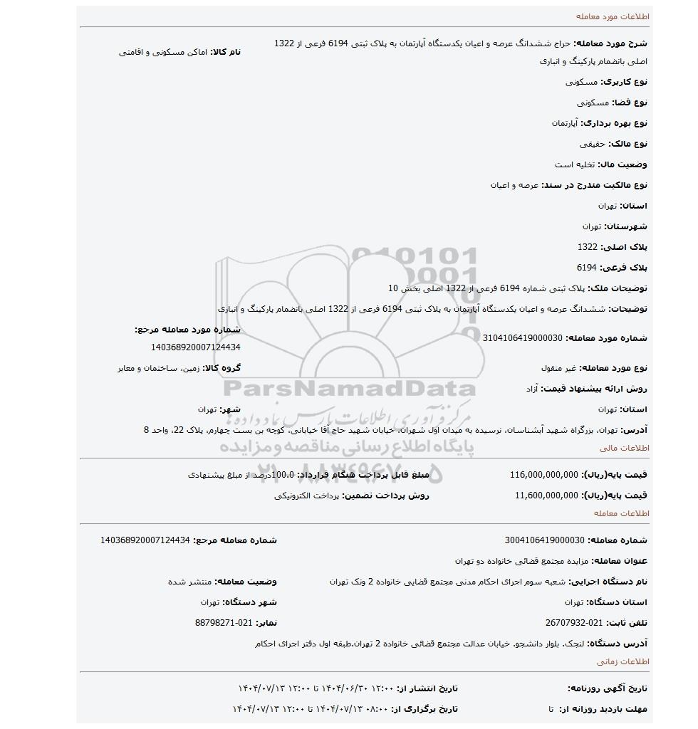 | شرح مورد معامله: حراج ششدانگ عرصه و اعیان یکدستگاه آپارتمان به پلاک ثبتی 6194 فرعی از 1322 اصلی بانضمام پارکینگ و انباری | نام کالا: اماکن مسکونی و اقامتی | |