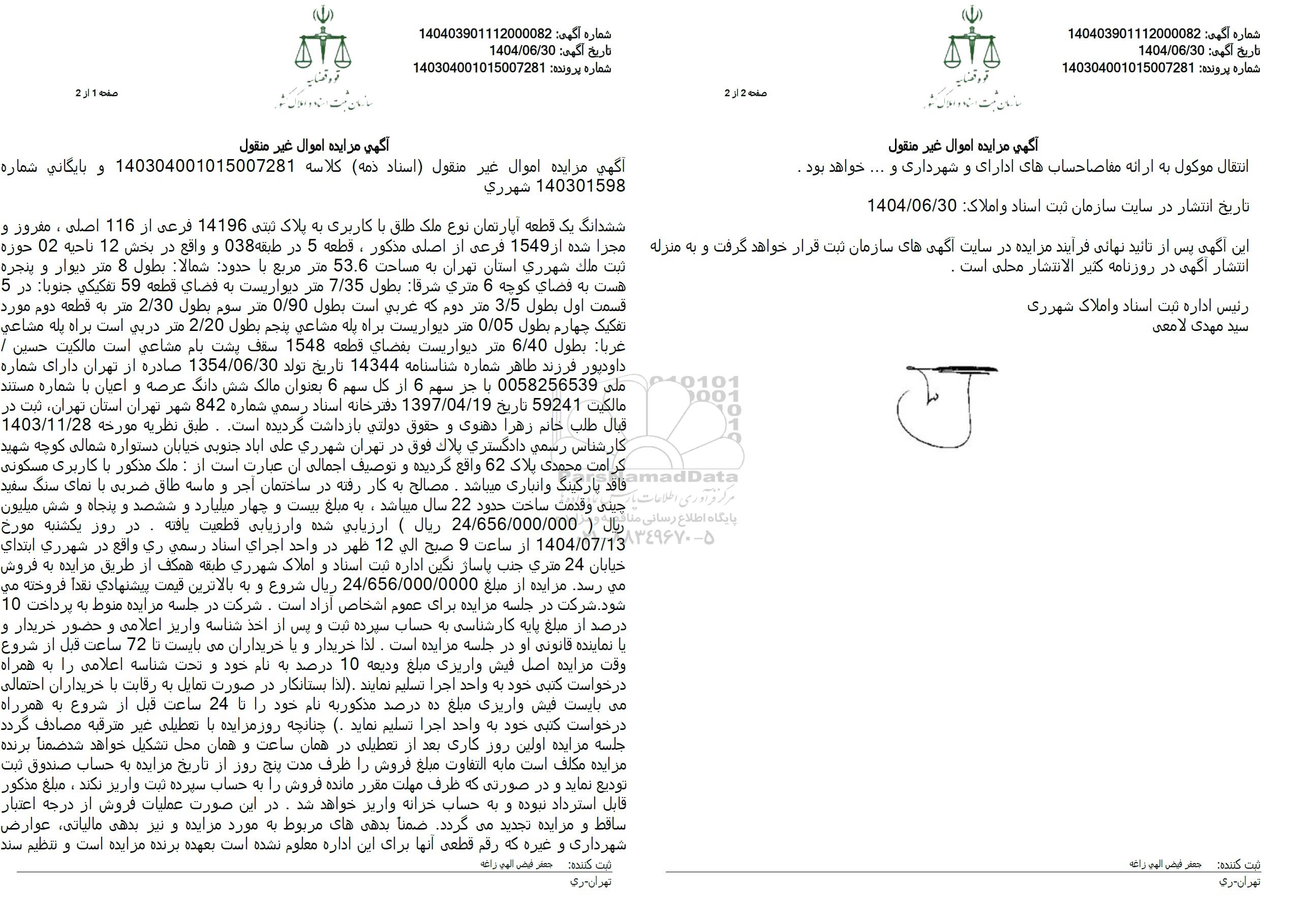 تاریخ انتشار در سایت سازمان ثبت اسناد و املاک: 1404.06.30