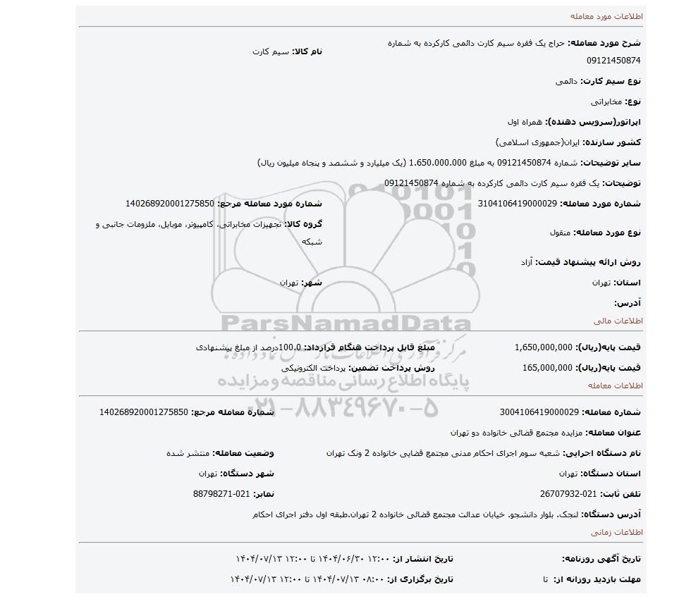 مزایده، یک فقره سیم کارت دائمی کارکرده به شماره  09121450874