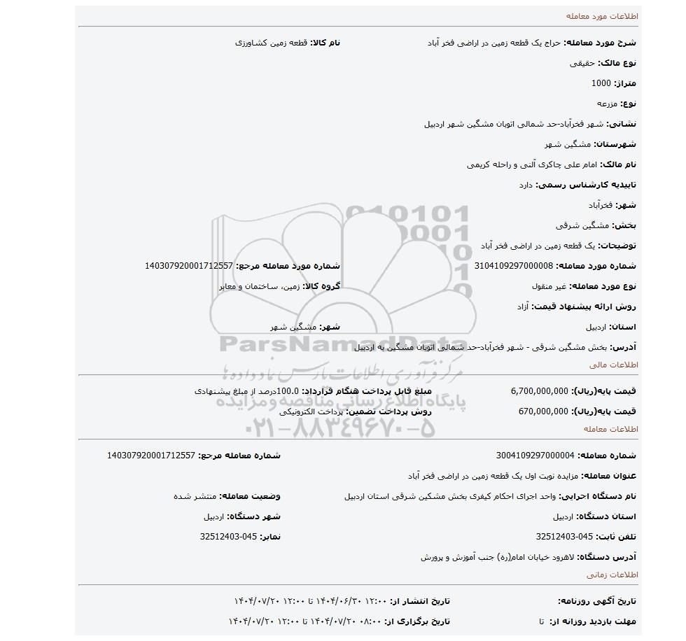 | شماره مورد معامله: 3104109297000008 | شماره مورد معامله مرجع: 140307920001712557 | |