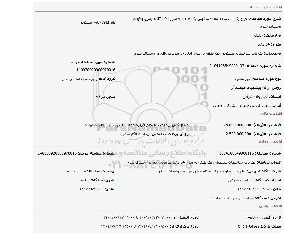 | شرح مورد معامله: حراج یک باب ساختمان مسکونی یک طبقه به متراژ 671.64 مترمربع واقع در روستای سرج | نام کالا: خانه مسکونی | |