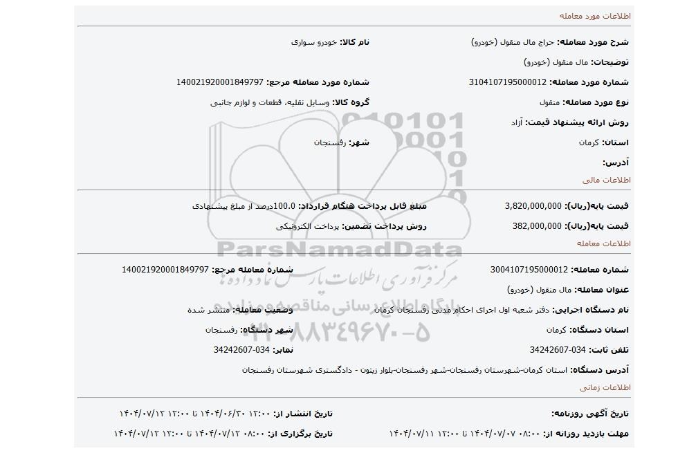 15 مزایده مال منقول (خودرو) 9809563 1404/08/15 new not special not payed کرمان