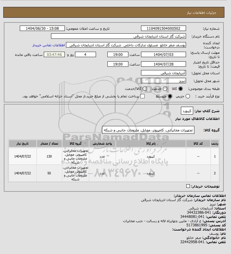 | 1 | -- | کیبورد | عدد | تجهیزات مخابراتی، کامپیوتر، موبایل، ملزومات جانبی و شبکه | 130 | 1404/07/22 |