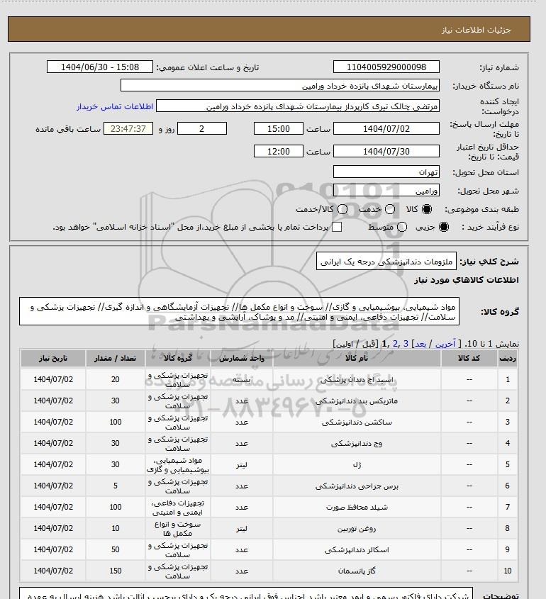 شرح کلی نیاز: ملزومات دندانپزشکی درجه یک ایرانی