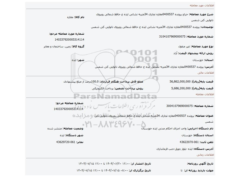 | عنوان معامله: پرونده 0400537مغازه تجاری 34متربه نشانی ایذه خ حافظ شمالی روبروی نانوایی کی شمس | ||