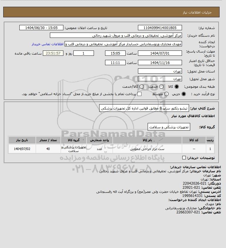 شرح کلی نیاز: تیشو رتکتور سایز 8 مطابق قوانین اداره کل تجهیزات پزشکی