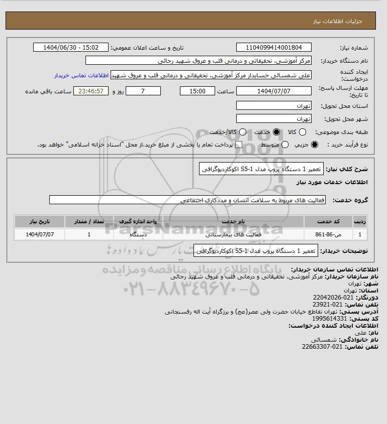 شرح کلی نیاز: تعمیر 1 دستگاه پروب مدل S5-1 اکوکاردیوگرافی