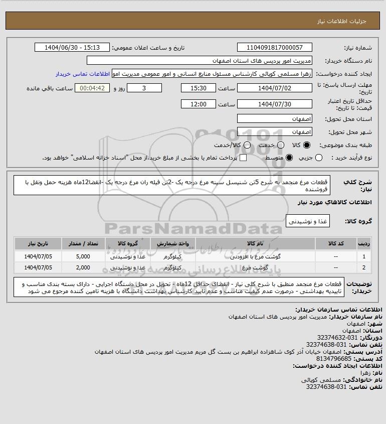 | 1 | -- | گوشت مرغ با افزودنی | کیلوگرم | غذا و نوشیدنی | 5,000 | 1404/07/05 |