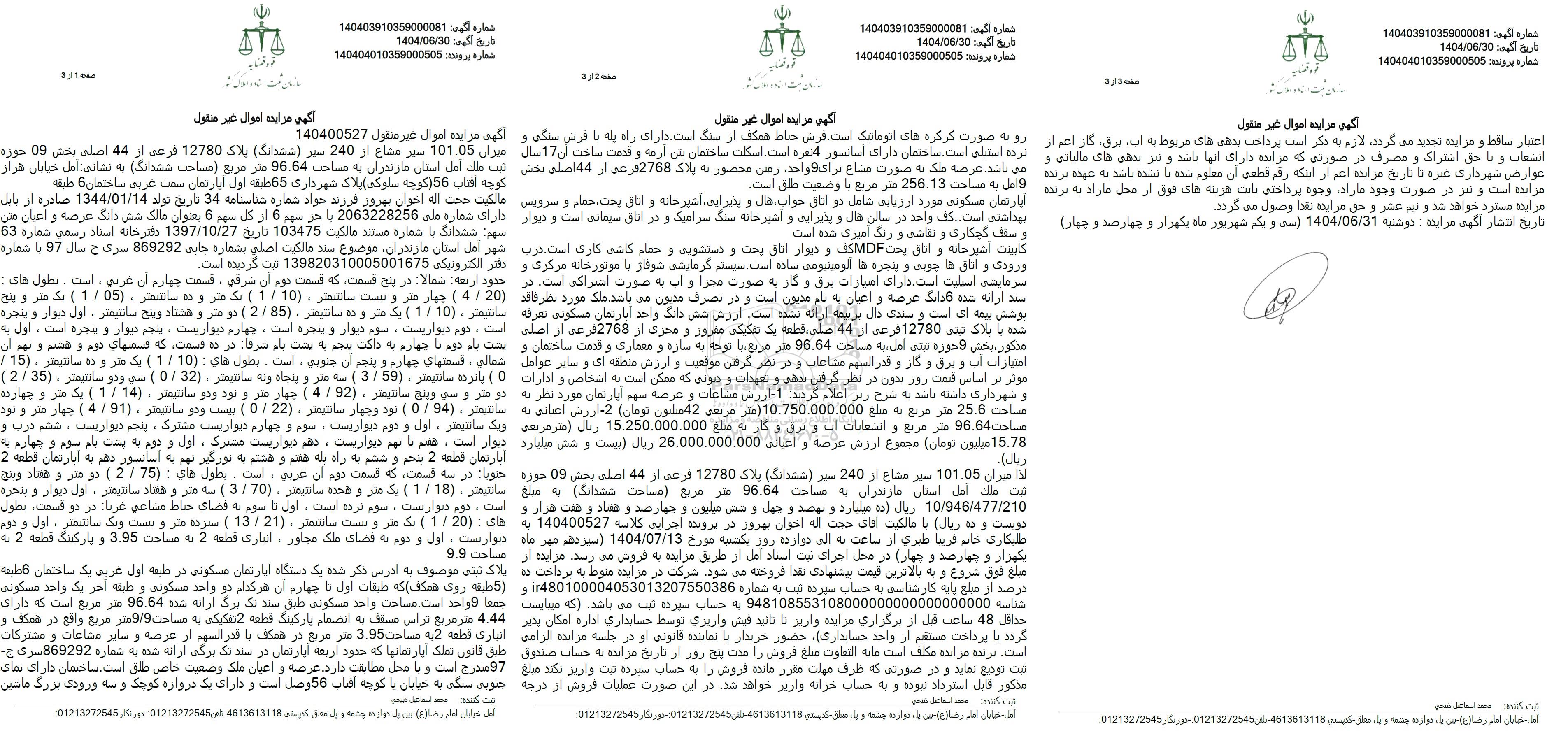 مزایده عمومی مزایده میزان 101.05 سیر مشاع از 240 سیر (ششدانگ) پلاک 12780 فرعی از 44 اصلی برگزار میگردد. از کلیه افراد متخصص و شرکتهای واجد شرایط دعوت به عمل میآید تا در این مزایده با کد خبرگزاری پارس نماد : 9579894 شرکت نمایند تاریخ شروع مزایده : 1404/06/30 مهلت شرکت در مزایده: تا پایان روز 1404/07/13