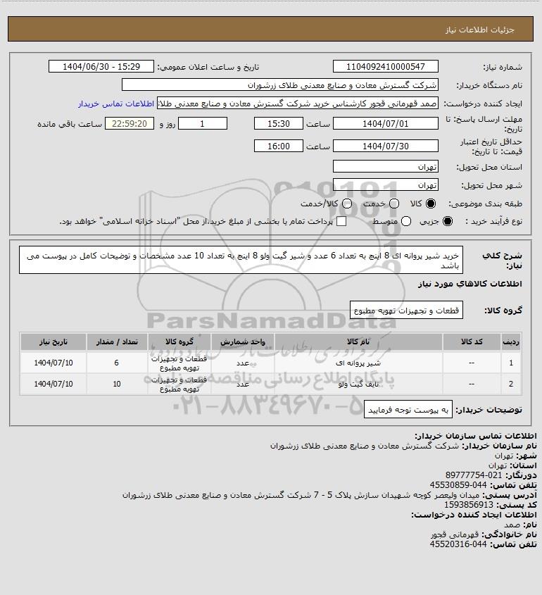شرح کلی نیاز: خرید شیر پروانه ای 8 اینچ به تعداد 6 عدد و شیر گیت ولو 8 اینچ به تعداد 10 عدد مشخصات و توضیحات کامل در پیوست می باشد