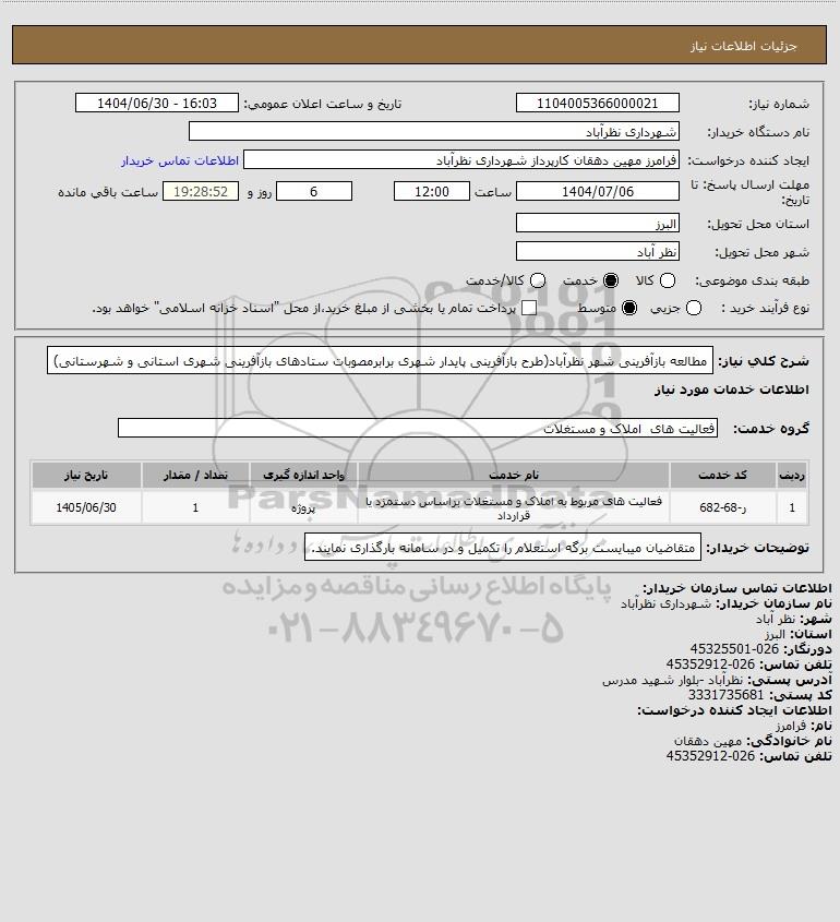 شرح کلی نیاز: مطالعه بازآفرینی شهر نظرآباد(طرح بازآفرینی پایدار شهری برابرمصوبات ستادهای بازآفرینی شهری استانی و شهرستانی)