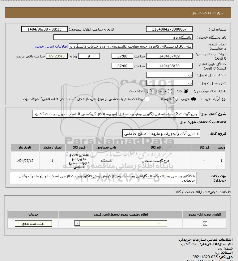 شرح کلی نیاز: چرخ گوشت 42 تمام استیل (گلویی وماردون استیل )موتورسه فاز گیربکسی 10اسب تحویل در دانشگاه یزد