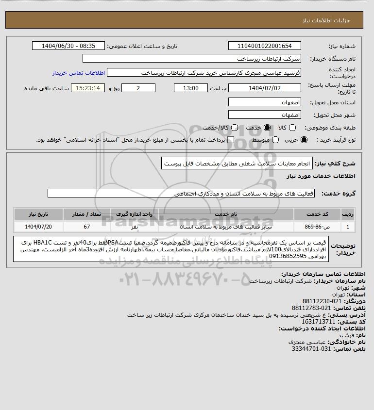 شرح کلی نیاز: انجام معاینات سلامت شغلی مطابق مشخصات فایل پیوست