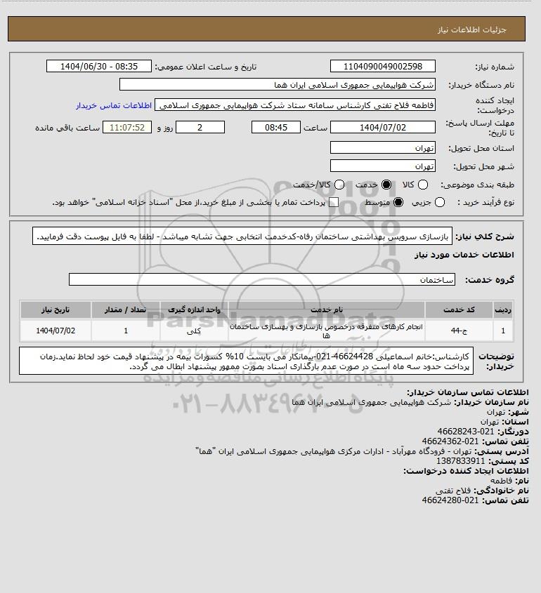 شرح کلی نیاز: بازسازی سرویس بهداشتی ساختمان رفاه-کدخدمت انتخابی جهت تشابه میباشد - لطفا به فایل پیوست دقت فرمایید.