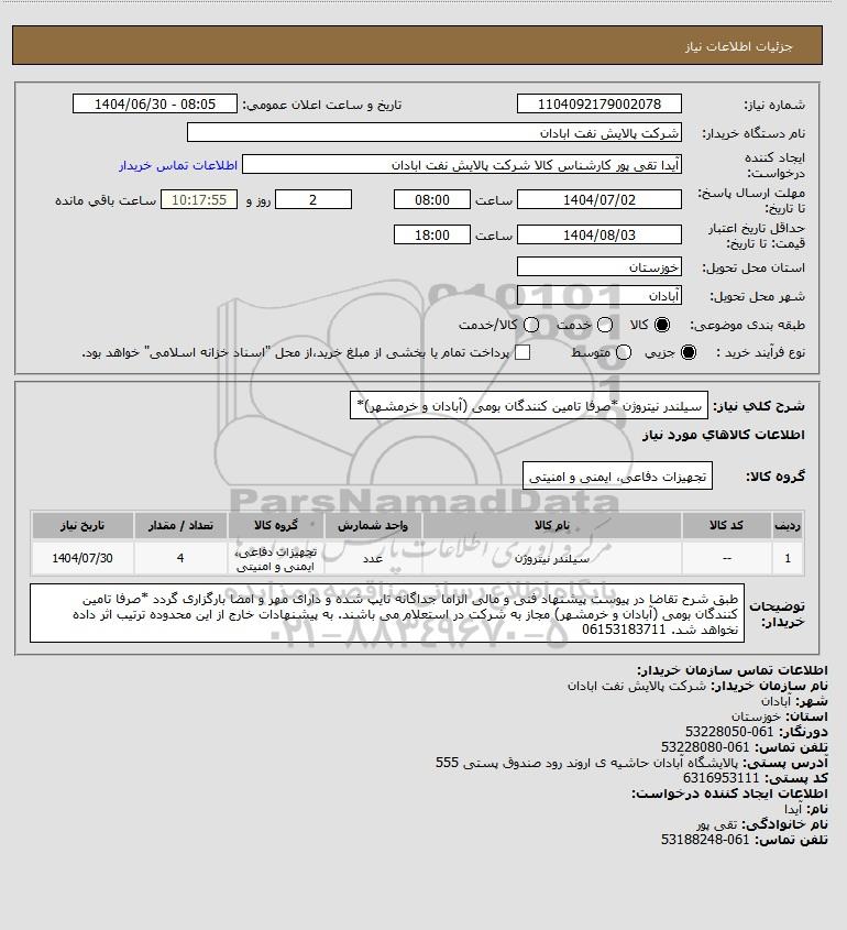 شرح کلی نیاز: سیلندر نیتروژن *صرفا تامین کنندگان بومی (آبادان و خرمشهر)*