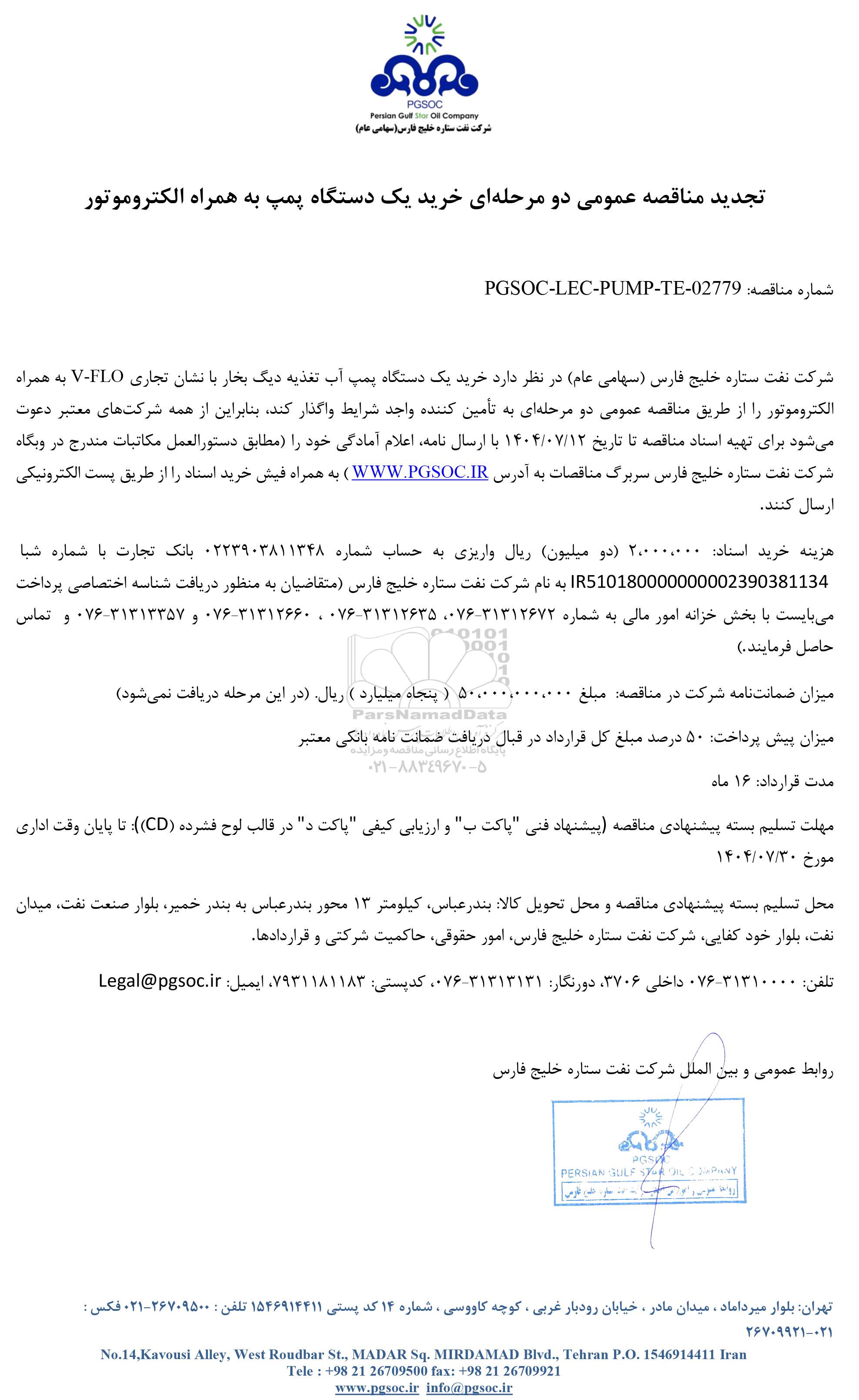 شماره مناقصه: PGSOC-LEC-PUMP-TE- 02779