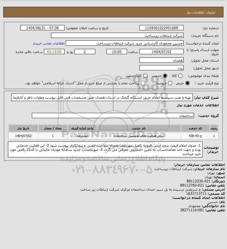 شرح کلی نیاز: تهیه و نصب سیستم اعلام حریق ایستگاه گرمک در استان همدان طبق مشخصات فنی فایل پیوست ونظرات ناظر و کارفرما