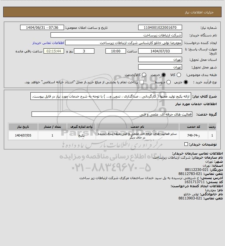 شرح کلی نیاز: ارائه پکیج تولید محتوا ( کارگردانی ، صداگذاری ، تدوین و... ) با توجه به شرح خدمات مورد نیاز در فایل پیوست.