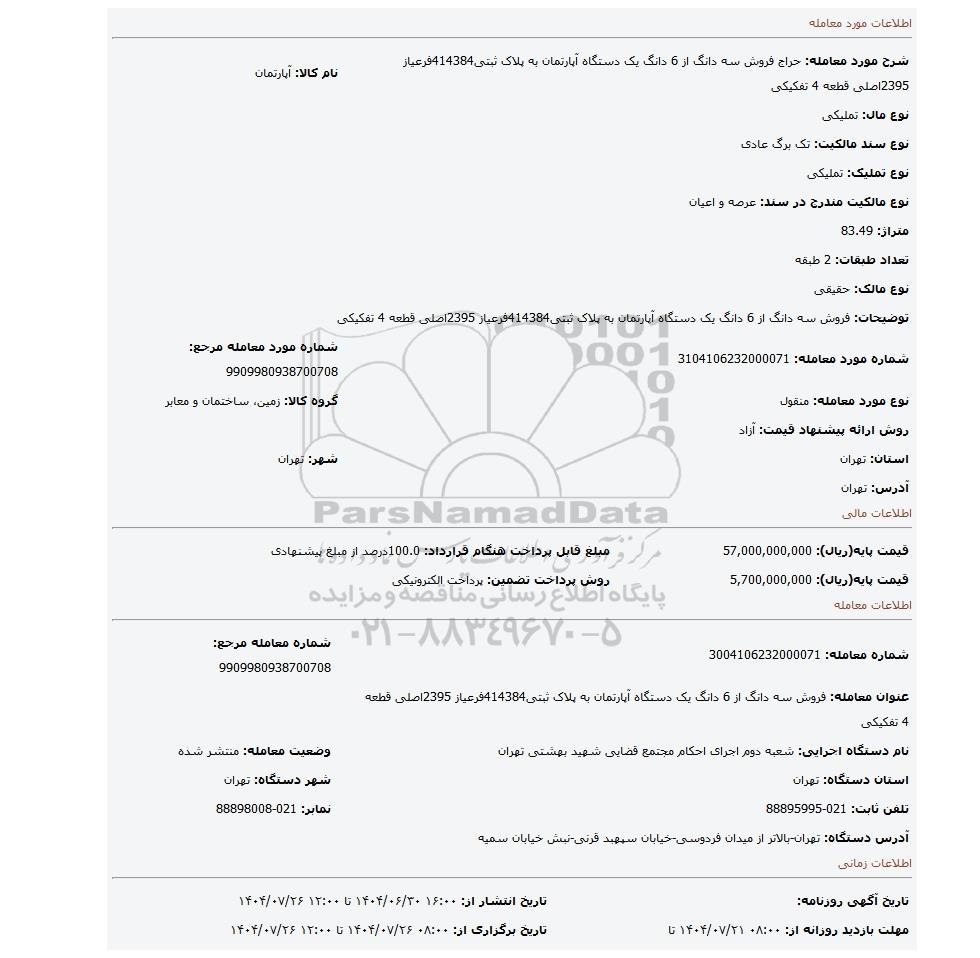 | عنوان معامله: فروش سه دانگ از 6 دانگ یک دستگاه آپارتمان به پلاک ثبتی414384فرعیاز 2395اصلی قطعه 4 تفکیکی | ||