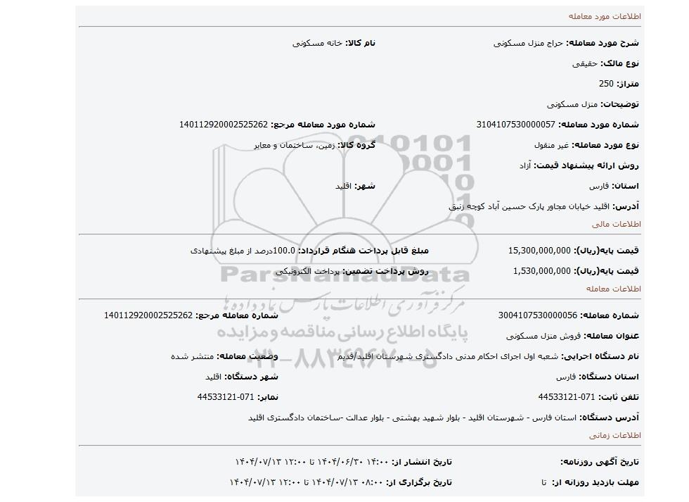 مزایده عمومی مزایده منزل مسکونی برگزار میگردد. از کلیه افراد متخصص و شرکت‌های واجد شرایط دعوت به عمل می‌آید تا در این مزایده با کد خبرگزاری پارس نماد : 9580927 شرکت نمایند تاریخ شروع مزایده : 1404/06/30 مهلت شرکت در مزایده: تا پایان روز 1404/07/13 مکان برگزاری اموال واگذاری استان‌های فارس و دسته‌بندی‌های مربوط به این حراجی املاک و زمین میباشد.