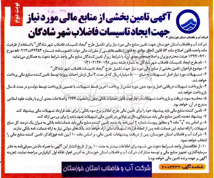 شرکت آب و فاضلاب استان خوزستان جهت تامین منابع مالی مورد نیاز برای تکمیل طرح "ایجاد تاسیسات فاضلاب شهر شادگان" با استفاده از ظرفیت ماده واحده قانون اصلاح ماده 56 قانون الحاق موادی به قانون تنظیم بخشی از مقررات مالی دولت (تصویب نامه شماره 69454 /ت 550913 مورخ 1393.06.20 هیئت محترم وزیران و اصلاحیه های بعدی آن ) با شرایط زیر از تامین کنندگان منابع مالی واجد شرایط دعوت به همکاری می نماید: