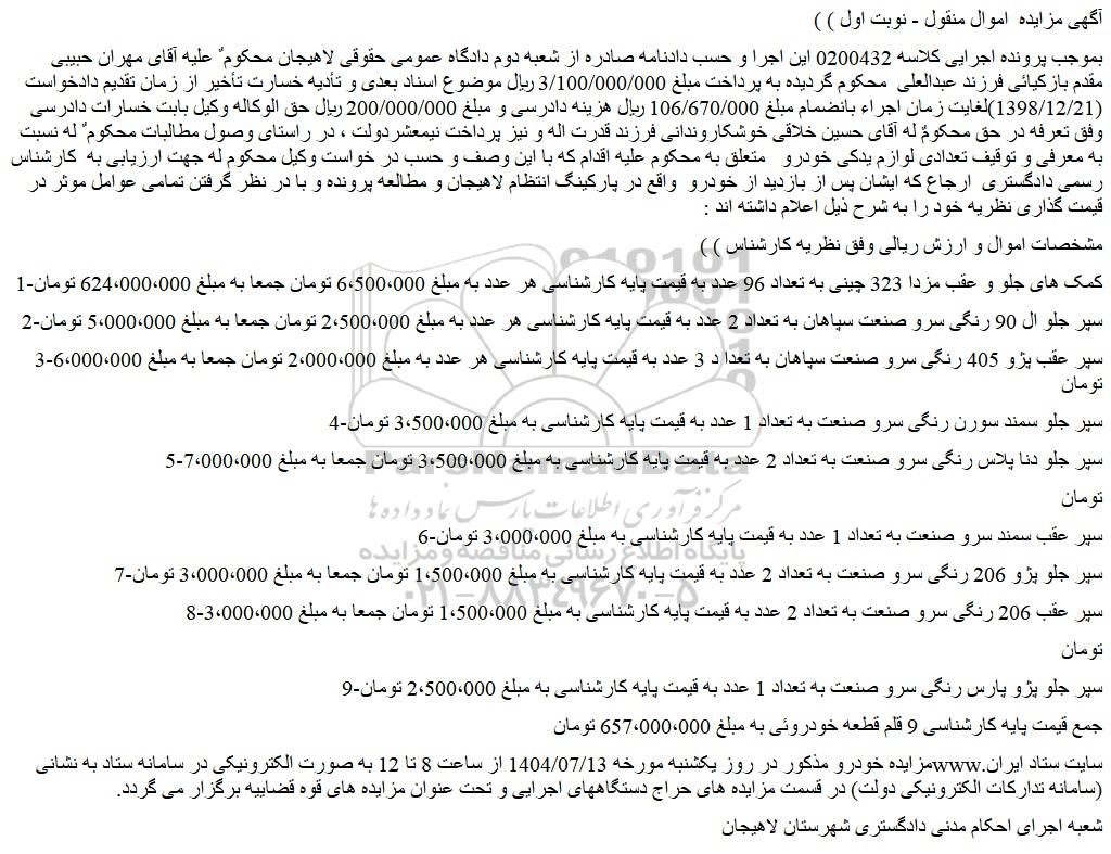بموجب پرونده اجرایی کلاسه 0200432 این اجرا و حسب دادنامه صادره از شعبه دوم دادگاه عمومی حقوقی لاهیجان محکوم ٌ علیه آقای مهران حبیبی مقدم بازکیائی فرزند عبدالعلی محکوم گردیده به پرداخت مبلغ 3/100/000/000 ریال موضوع اسناد بعدی و تأدیه خسارت تأخیر از زمان تقدیم دادخواست (1398/12/21)لغایت زمان اجراء بانضمام مبلغ 106/670/000 ریال هزینه دادرسی و مبلغ 200/000/000 ریال حق الوکاله وکیل بابت خسارات دادرسی وفق تعرفه در حق محکومٌ له آقای حسین خلاقی خوشکاروندانی فرزند قدرت اله و نیز پرداخت نیمعشردولت ، در راستای وصول مطالبات محکوم ٌ له نسبت به معرفی و توقیف تعدادی لوازم یدکی خودرو متعلق به محکوم علیه اقدام که با این وصف و حسب در خواست وکیل محکوم له جهت ارزیابی به کارشناس رسمی دادگستری ارجاع که ایشان پس از بازدید از خودرو واقع در پارکینگ انتظام لاهیجان و مطالعه پرونده و با در نظر گرفتن تمامی عوامل موثر در قیمت گذاری نظریه خود را به شرح ذیل اعلام داشته اند :