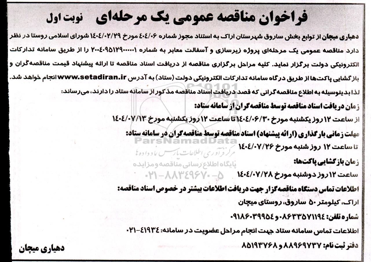 دهیاری میچان از توابع بخش ساروق شهرستان اراک به استناد مجوز شماره 404/06 مورخ 1404.02.29 شورای اسلامی روستا در نظر دارد مناقصه عمومی یک مرحله ای پروژه زیرسازی و آسفالت معابر به شماره 2004095129000001 را از طریق سامانه تدارکات الکترونیکی دولت برگزار نماید. کلیه مراحل برگزاری مناقصه از دریافت اسناد مناقصه تا ارائه پیشنهاد قیمت مناقصه گران و بازگشایی پاکتها از طریق درگاه سامانه تدارکات الکترونیکی دولت (ستاد) به آدرس ستاد ایران انجام خواهد شد.