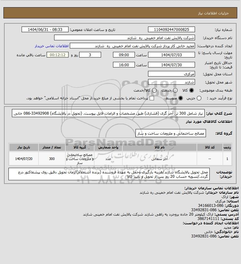 استعلام نیاز شامل 300 تن آجر گری (فشاری) طبق مشخصات و الزامات فایل پیوست. (تحویل در پالایشگاه) 33492908-086 خانی, استعلام نیاز شامل 300 تن آجر گری (فشاری) طبق مشخصات و الزامات فایل پیوست. (تحویل در پالایشگاه) 33492908-086 خانی