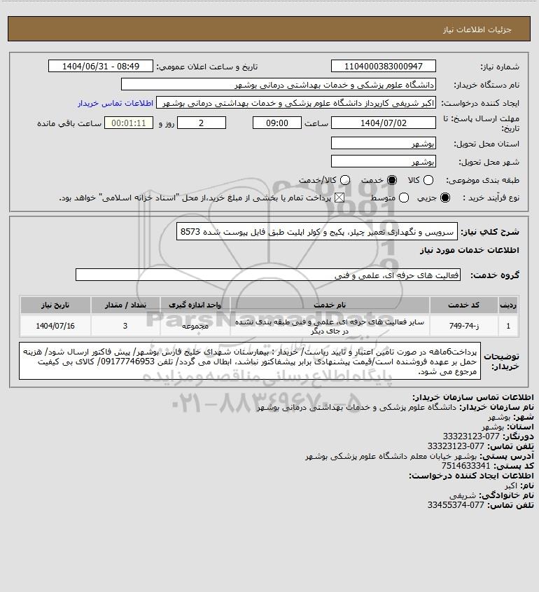 شرح کلی نیاز: سرویس و نگهداری تعمیر چیلر، پکیج و کولر اپلیت طبق فایل پیوست شده 8573