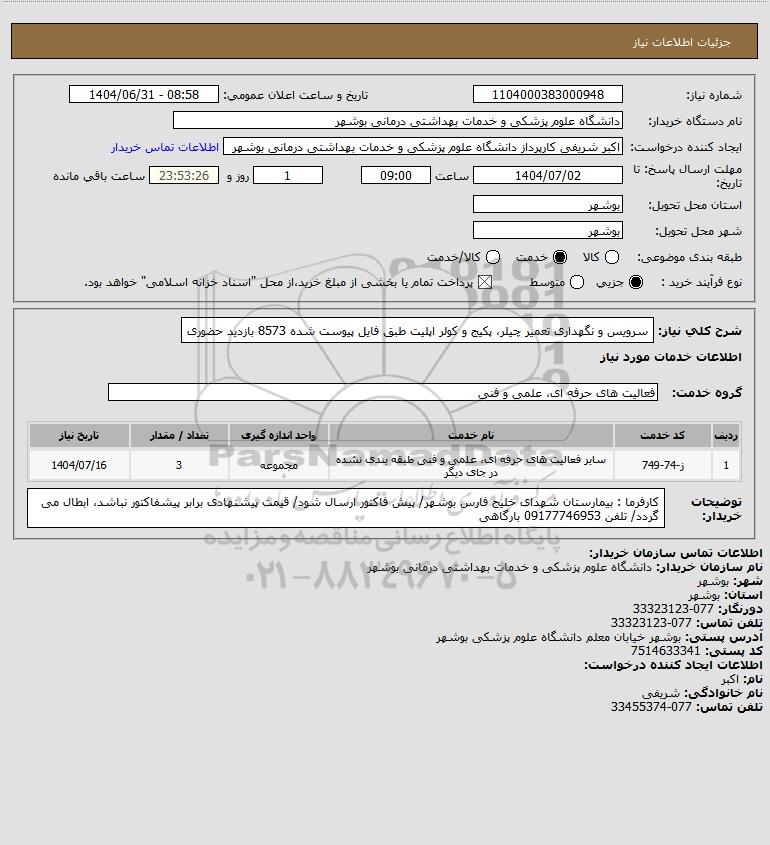 استعلام سرویس و نگهداری تعمیر چیلر پکیج و کولر اپلیت طبق فایل پیوست شده 8573 بازدید حضوری, استعلام سرویس و نگهداری تعمیر چیلر، پکیج و کولر اپلیت طبق فایل پیوست شده 8573 بازدید حضوری