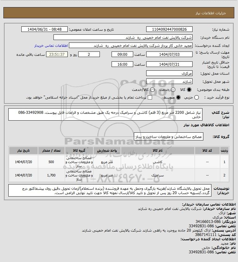 شرح کلی نیاز: نیاز شامل 2200 متر مربع (3 قلم) کاشی و سرامیک درجه یک طبق مشخصات و الزامات فایل پیوست. 33492908-086 خانی