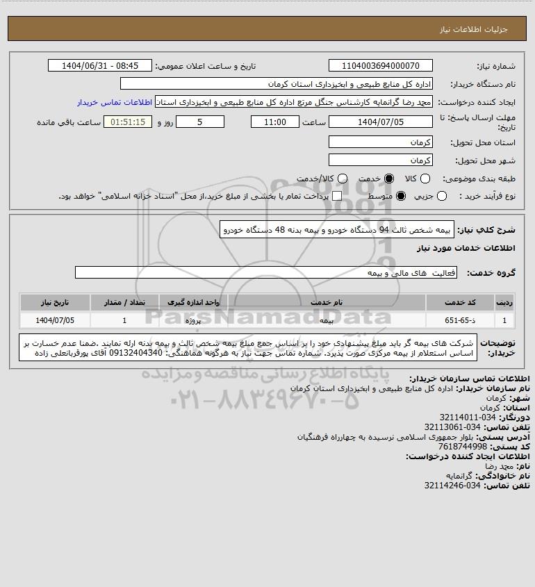 شرح کلی نیاز: بیمه شخص ثالث 94 دستگاه خودرو و بیمه بدنه 48 دستگاه خودرو
