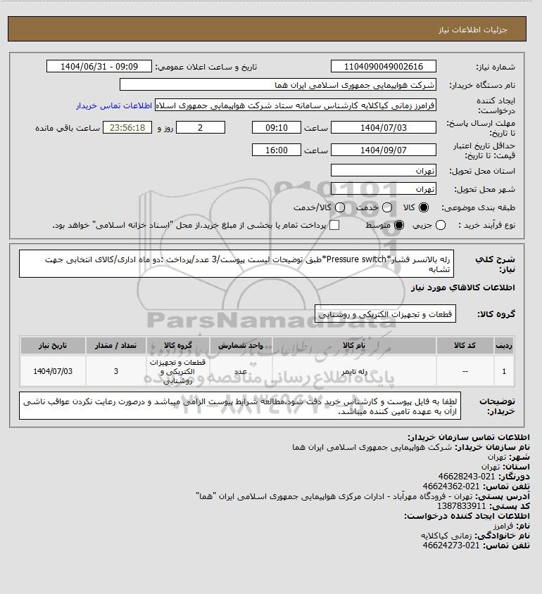 شرح کلی نیاز: رله بالانسر فشار*Pressure switch*طبق توضیحات لیست پیوست/3 عدد/پرداخت :دو ماه اداری/کالای انتخابی جهت تشابه
