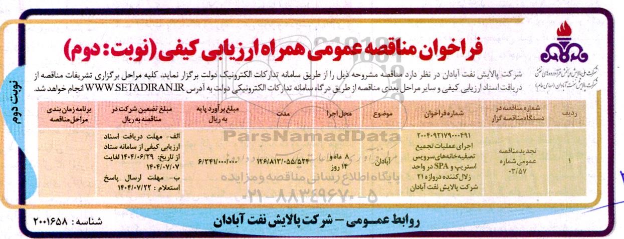 | 1 | تجدید مناقصه عمومی شماره 03/57 | 2004092179000491 اجرای عملیات تجمیع تصفیه خانه های سرویس استریپ و SPA در واحد زلال کننده دروازه 21 شرکت پالایش نفت آبادان | آبادان | 8 ماه و 14 روز | 126.813.055.524 | 6.341.000.000 | الف- مهلت دریافت اسناد ارزیابی کیفی از سامانه ستاد از تاریخ 1404.06.29 لغایت 1404.07.07 ب- مهلت ارسال پاسخ استعلام: 1404.07.22 |