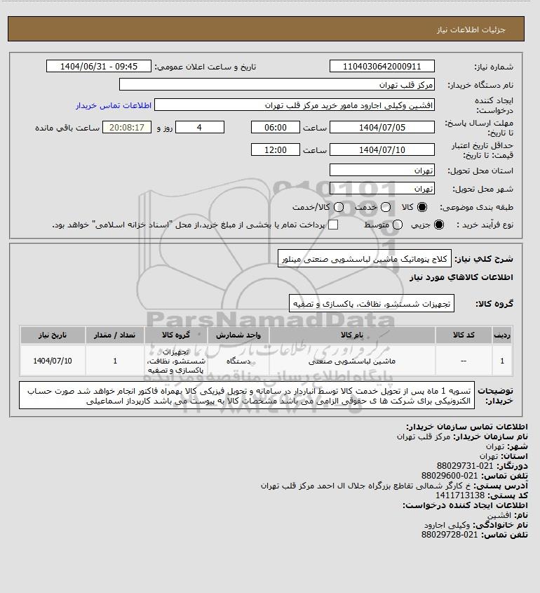 | 1 | -- | ماشین لباسشویی صنعتی | دستگاه | تجهیزات شستشو، نظافت، پاکسازی و تصفیه | 1 | 1404/07/10 |