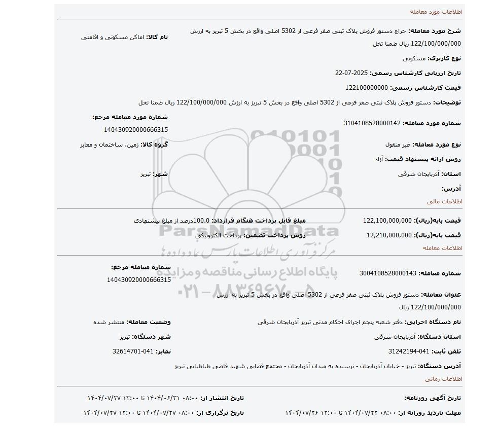 شرح مورد معامله: حراج دستور فروش پلاک ثبتی صفر فرعی از 5302 اصلی واقع در بخش 5 تبریز به ارزش 122/100/000/000 ریال ضمنا تخلنام کالا: اماکن مسکونی و اقامتی
