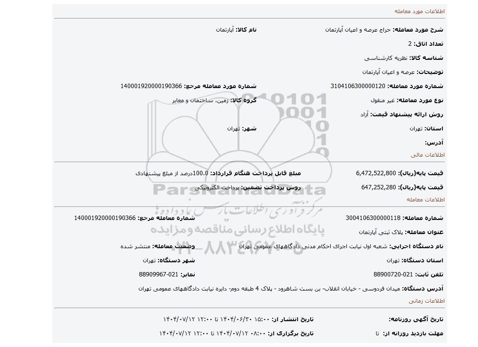 شرح مورد معامله: حراج عرصه و اعیان آپارتمان نام کالا: آپارتمان
